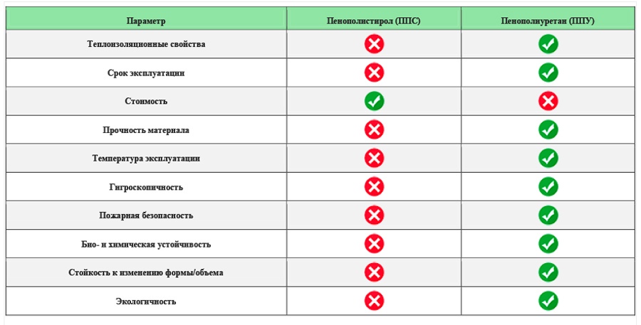 Итак, по результатам сравнения можно однозначно сказать, что пенополиуретан (ППУ) как утеплитель, практически по всем характеристикам превосходит пенополистирол (ППС).