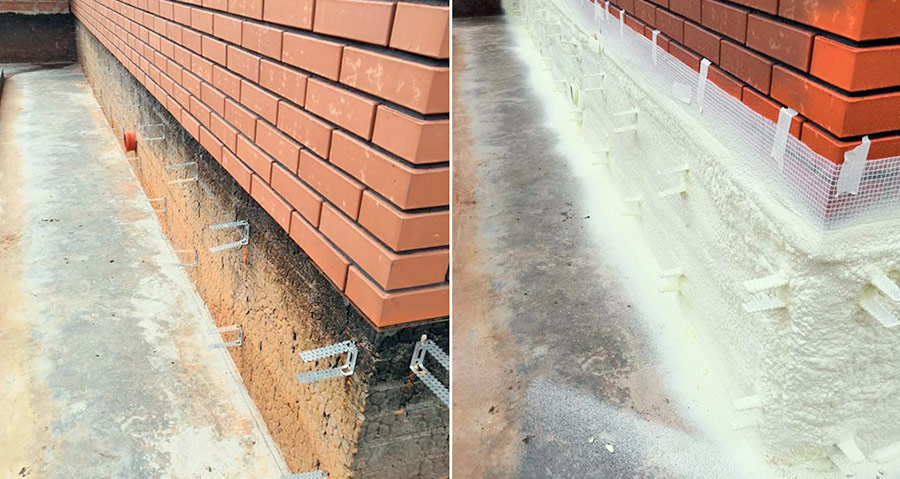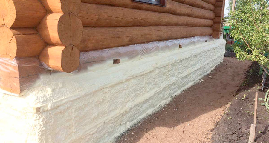 Главным характерным отличием утепления фундамента пенополиуретаном (ППУ) является способ его нанесения. Изначально материал представлен двумя жидкими компонентами, которые после смешивания образуют плотную пену. Она быстро увеличивает свой объем, а потом твердеет, создавая пористую структуру с превосходными теплоизоляционными характеристиками: